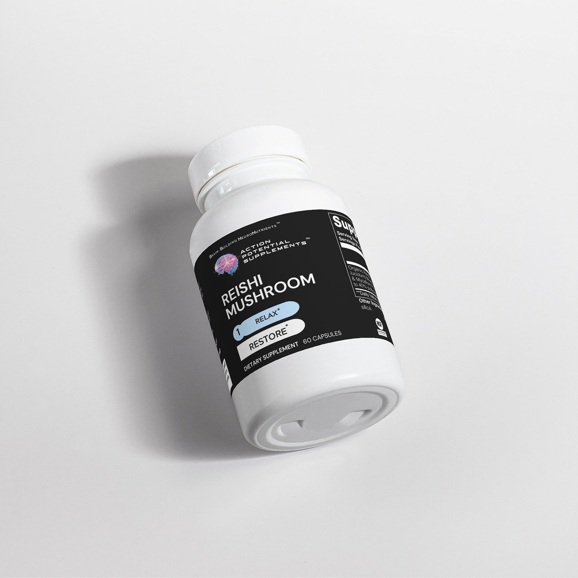 Organic Reishi (Ganoderma lucidum) Mushroom Fruiting Body & Mycelium Powder (standardized to 40% polysaccharides [400 mg]), Vegan Capsule (modified cellulose, water), Silica.