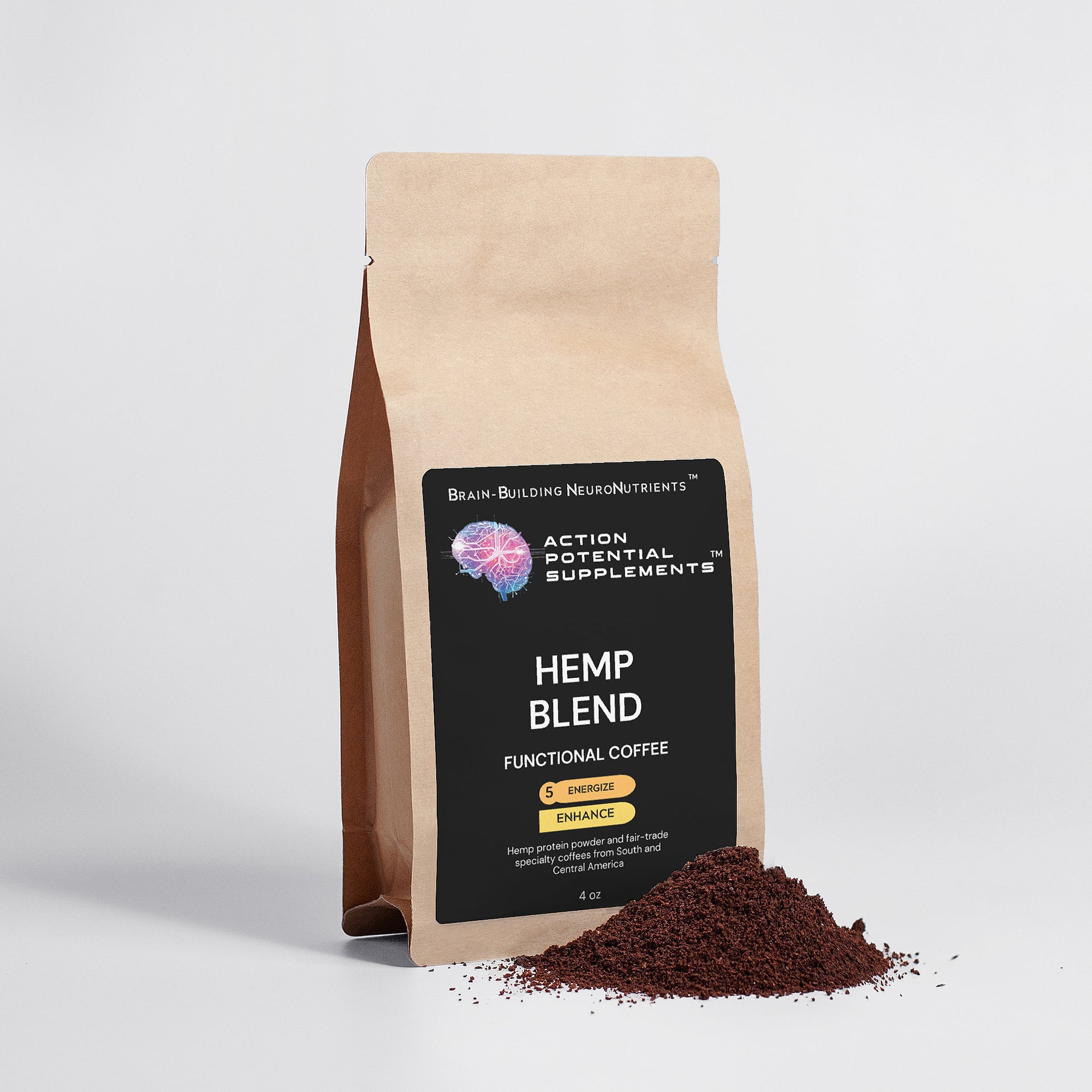 Ingredients: 90% USDA Organic Arabica Coffee + 10% USDA Organic Hemp Protein Powder.