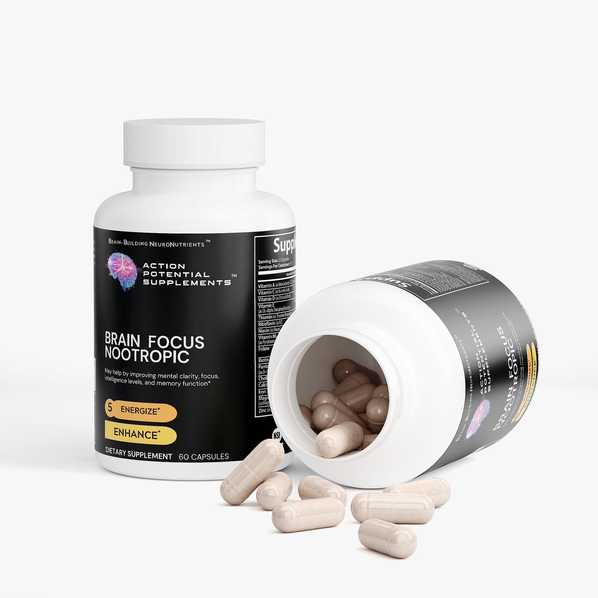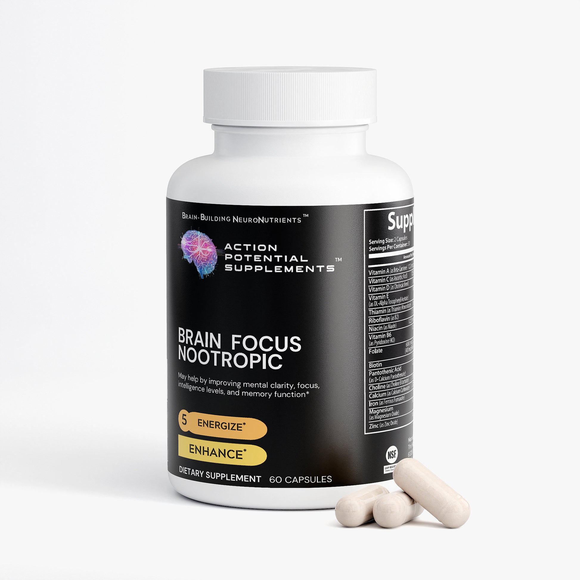 Vitamin A (as Beta-Carotene), Vitamin C (as Ascorbic Acid), Calcium (as Calcium Carbonate), Iron (as Ferrous Fumarate), Vitamin D (as Cholecalciferol), Vitamin E (as DL-Alpha-Tocopheryl Acetate), Vitamin B1 (as Thiamine Mononitrate), Vitamin B2 (as Riboflavin), Vitamin B3 (as Niacin), Vitamin B6 (as Pyridoxine HCL), Folate, Biotin, Vitamin B5 (as D-Calcium Pantothenate), Magnesium (as Magnesium Oxide), Zinc (as Zinc Oxide), Selenium (as Selenium Amino Acid Chelate), Copper (as Copper Gluconate), Manganese (as Manganese Amino Acid Chelate), Chromium (as Chromium Picolinate), Molybdenum, Potassium (as Potassium Citrate), Choline (as Choline Bitartrate), Proprietary Blend (DMAE Bitartrate, L-Glutamine HCL, Glutamic Acid, Green Tea Extract, Bacopa Extract, Inositol, N-Acetyl L-Tyrosine, Bilberry Fruit Extract, GABA, Grape Seed Extract, Grapefruit Seed Extract, Olive Leaf, Cinnamon Bark Extract, Licorice Root Extract, Boron, DHA 14%, Vanadyl, Phosphatidylserine, Huperzine A), Cellulose (Vegetable Capsule), Rice Flour, Magnesium Stearate, Silicon Dioxide.